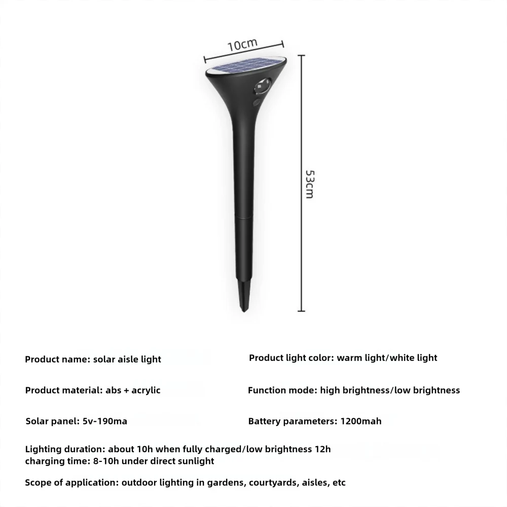 Lighting duration: Full charge, high brightness about 10H/low brightness 12H Charging time: 8-10H under direct sunlight